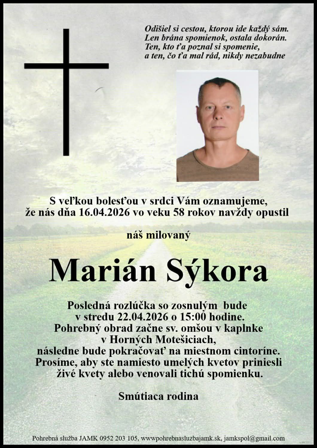 Posledná rozlúčka sa uskutoční 22.4.2026 o 15:00 v kaplnke v Horných Motešiciach.